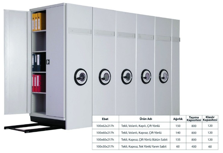Kompakt Arşiv Sistem,tekerlekleri ile özel hazırlanmış lama raylar üzerinde her dolap sırasının kenarında bulunan direksiyon kolunu çevirerek veya dolap üzerindeki kolu çekerek hareket ettirilen birbirinden ayrılan ve birbirine yanaşan seri dolaplardan oluşmaktadır.